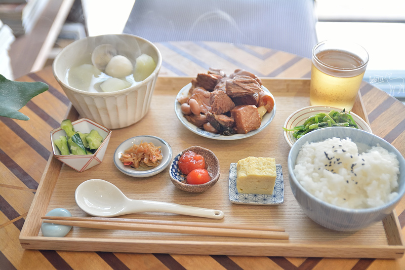 期間限定的定食有兩種:綠咖哩烏龍涼麵和虱目魚湯,我們都點了前者。綠咖哩烏龍涼麵附上簡單漬物和一杯蜂蜜檸檬水。西南的泰味澆頭和東北的和風麵條在台北相遇,開胃清爽的亞洲味。若當正餐,分量稍嫌意猶未盡,男生可能得再吃點零食。